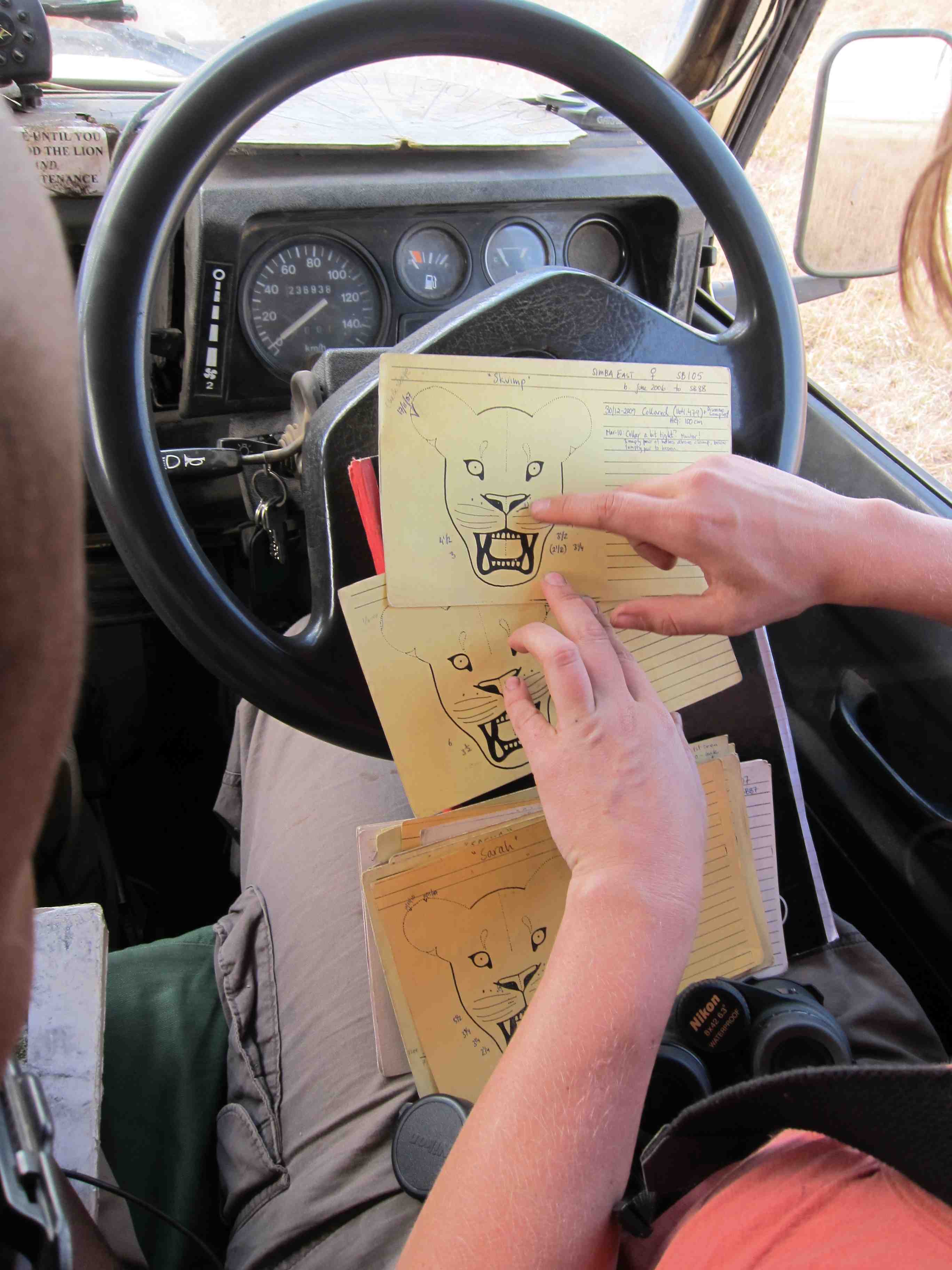 The information generated by radio-tracking the lions is…pretty incredible. It means we can find our lions even when they’re in dense areas with poor visibility, or outside of their normal territories. The lions are very habituated to vehicles, especially the Lion Project cars, and we get right up close to identify individual lions based on their unique “whisker spot” patterns.