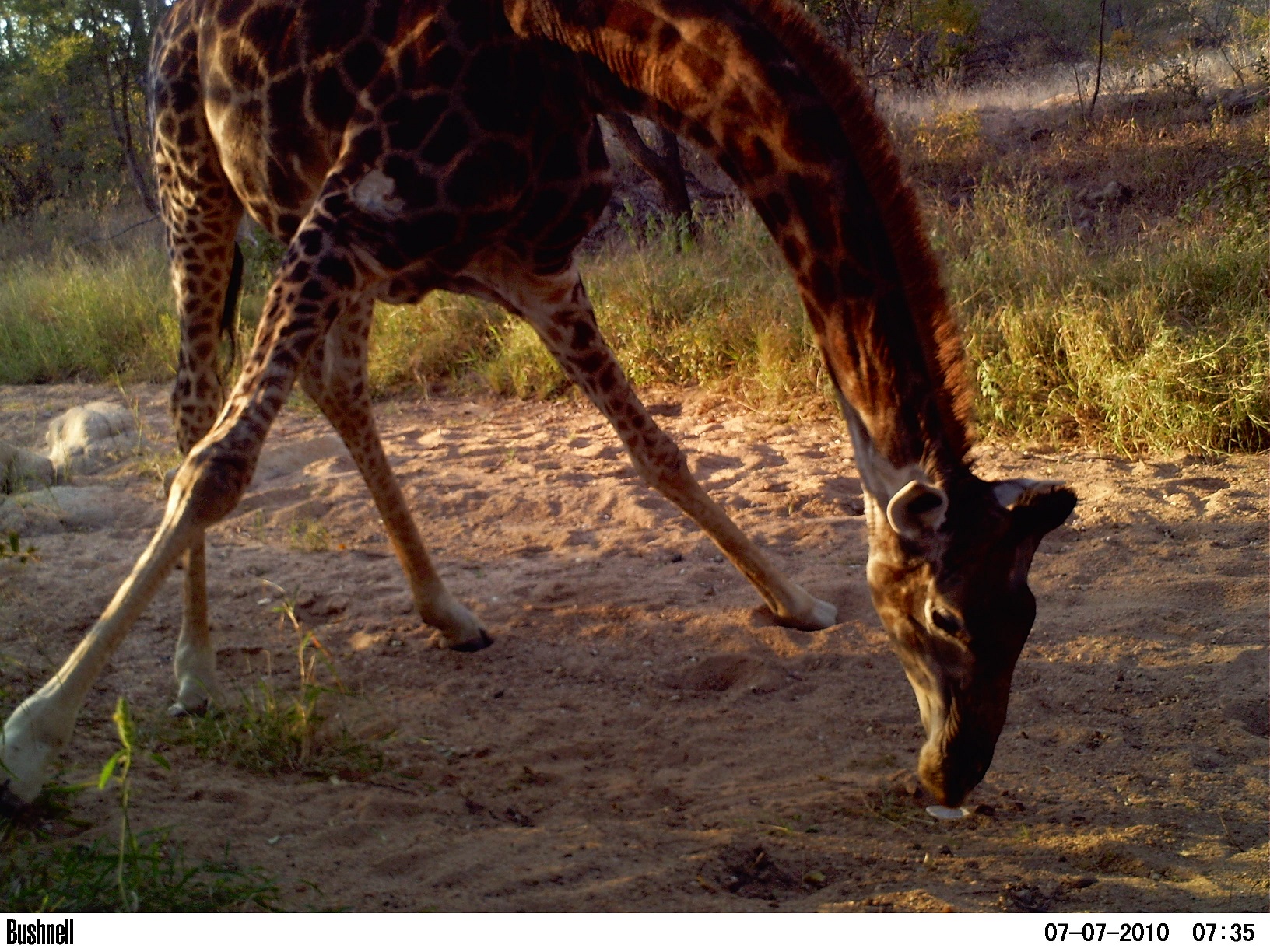 In the end it didn’t work, It rained a couple of nights later and my efforts where washed away. We never did find the perfect scent. We were told that tinned sardines worked wonders as well as catnip and perfume. We tried them all. It seems our cats where immune to these. The only thing that stopped them in their tracks was the scent of other leopards. I did learn however that the scent of tinned sardines was particularly interesting to giraffe of all animals. My method was to bury a plastic cup up to its rim in sand and put a blob of sardines in the cup. Now you would have thought that giraffe would have walked on by but as the picture below testifies, giraffe just have to take a closer look. You always learn something new!