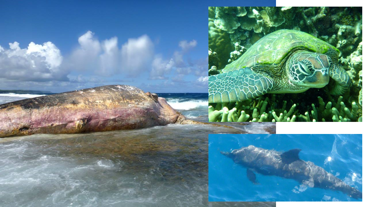 The ocean’s vertebrate life (the massive pink object on the left is a dead sperm whale which snagged up on the reef half a mile off-shore)