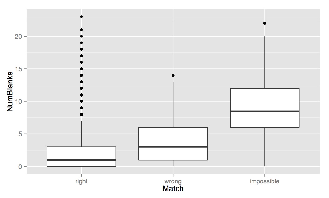 Evenness: The boxplot below shows the mean “Evenness” score described above vs. how the consensus answer matched the gold standard answer. What you can see below is that the average evenness score for “correct” answers is about 0.25, and the average evenness score for wrong and impossible answers is 0.75. Although there are some correct answers with high evenness scores, there are almost no wrong/impossible answers with evenness scores below 0.5.