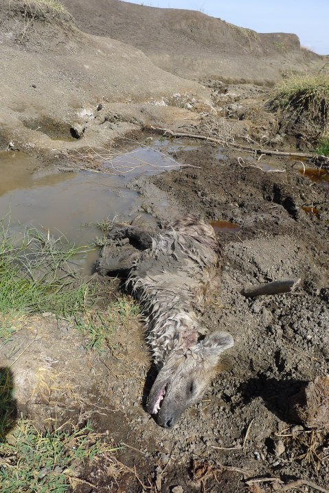 It was obvious that several lion had been in the area, you could see depressions in the sand where they had lay down for a bit of a nap. The tracks lead alongside a small water drainage channel and the lions had wandered down to drink in a few spots. Further along the water channel the tracks of individual lions suddenly converged on one access path down to the water. Clearly something had excited their interest. After a careful look around we descended the same route to investigate. Lying in the mud at the edge of the water we found the body of a young spotted hyena, teeth marks around its throat and the surrounding tracks told the story. Most likely the youngster was drinking when the lions ambushed it, its small size meant it didn’t stand a chance and lions probably quickly dispatched it.