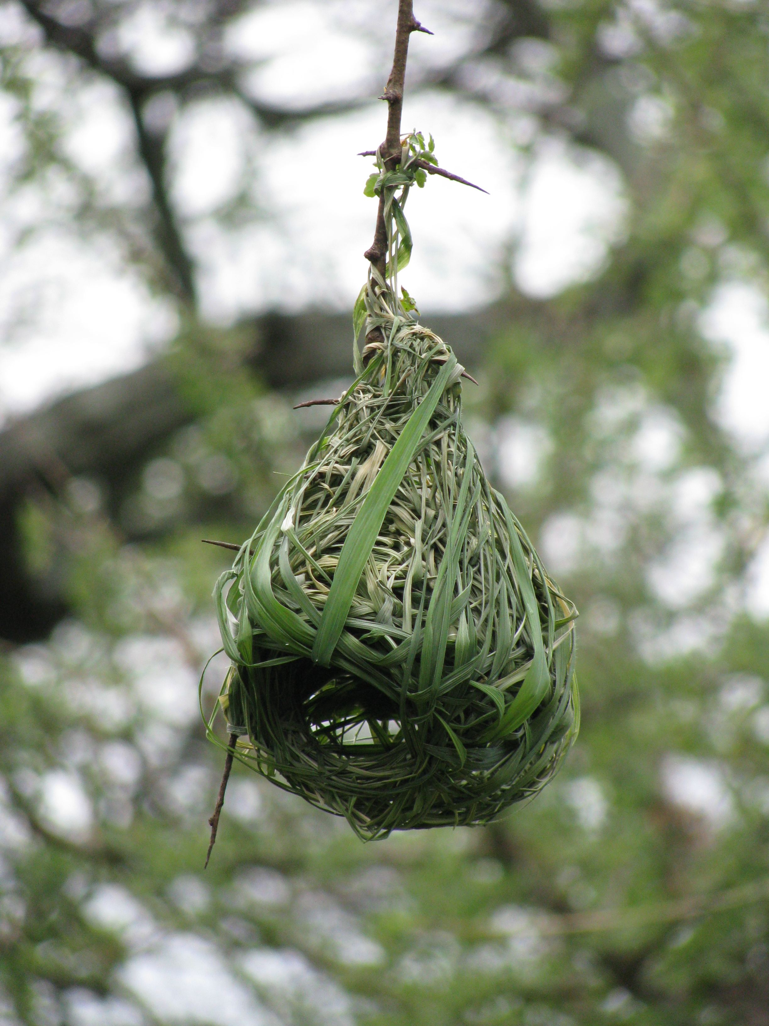 Several years ago, I watched through a Lion House window as a weaver bird build its nest from scratch. The bird started with just a branch, one with something of a knot at the end where a twig may have split off in the past. The weaver grabbed a long blade of grass and wrapped it around that knobby joint and tucked the blade under itself, as you might do if you were tying your shoe. Then it got another blade of grass and wove that through the loop it had created with the first blade, tucking it securely back under and through the loop a second time. It continued to add blades for the next twenty minutes or so, such that the grass formed two clumps, one sticking out of either side of the knot.