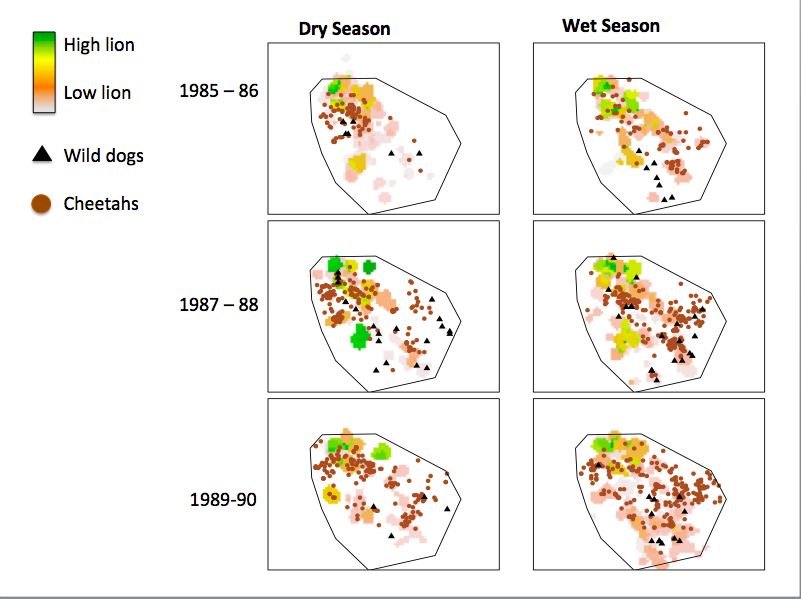 The good news is that the data was totally worth it. Just like we suspected, even though cheetahs didn’t seem to be avoiding lions, wild dogs were. This map shows lion densities in the background, with cheetah (in brown dots) and wild dog (black triangles) locations overlaid on the lion densities.