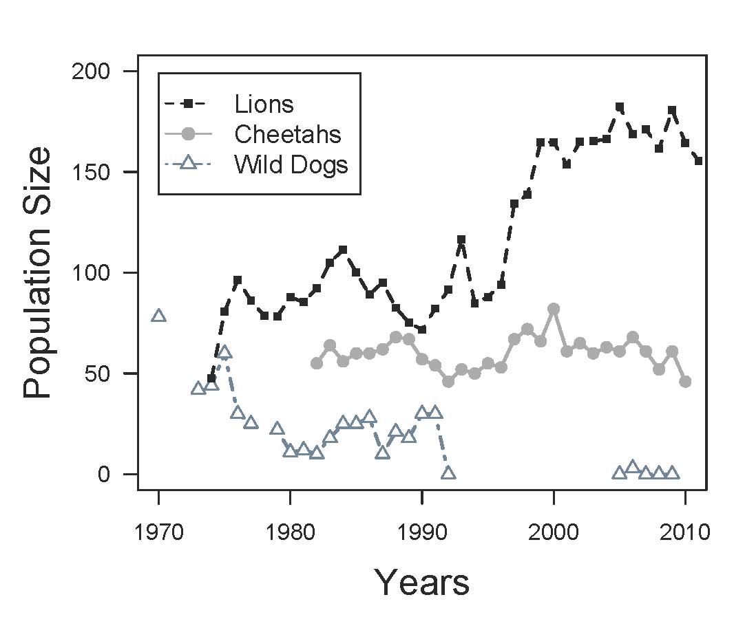 The number of lions, cheetahs, and wild dogs from 1970 onwards. Wild dogs disappeared from the ecosystem from 1992 through 2005.