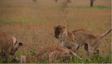 All lions took turns digging. The two older and more experienced lions dug with more force and determination. SuPer Qt seemed to dig more randomly. Her inexperience showed in more comical ways too. Twice she managed to place herself in a position behind a digging lion, getting her face full of dirt. Another time she circled the burrow and instead of walking around the oldest female she decided to walk under it. Something got SuPer Qt’s attention down the hole and she stood up while still under the old female who got her hind legs air borne. The old female was too busy looking down the burrow to seem to notice. They stood like this for a good while until the old female ungracefully, one leg at the time, managed to get her hind feet on the ground again.
